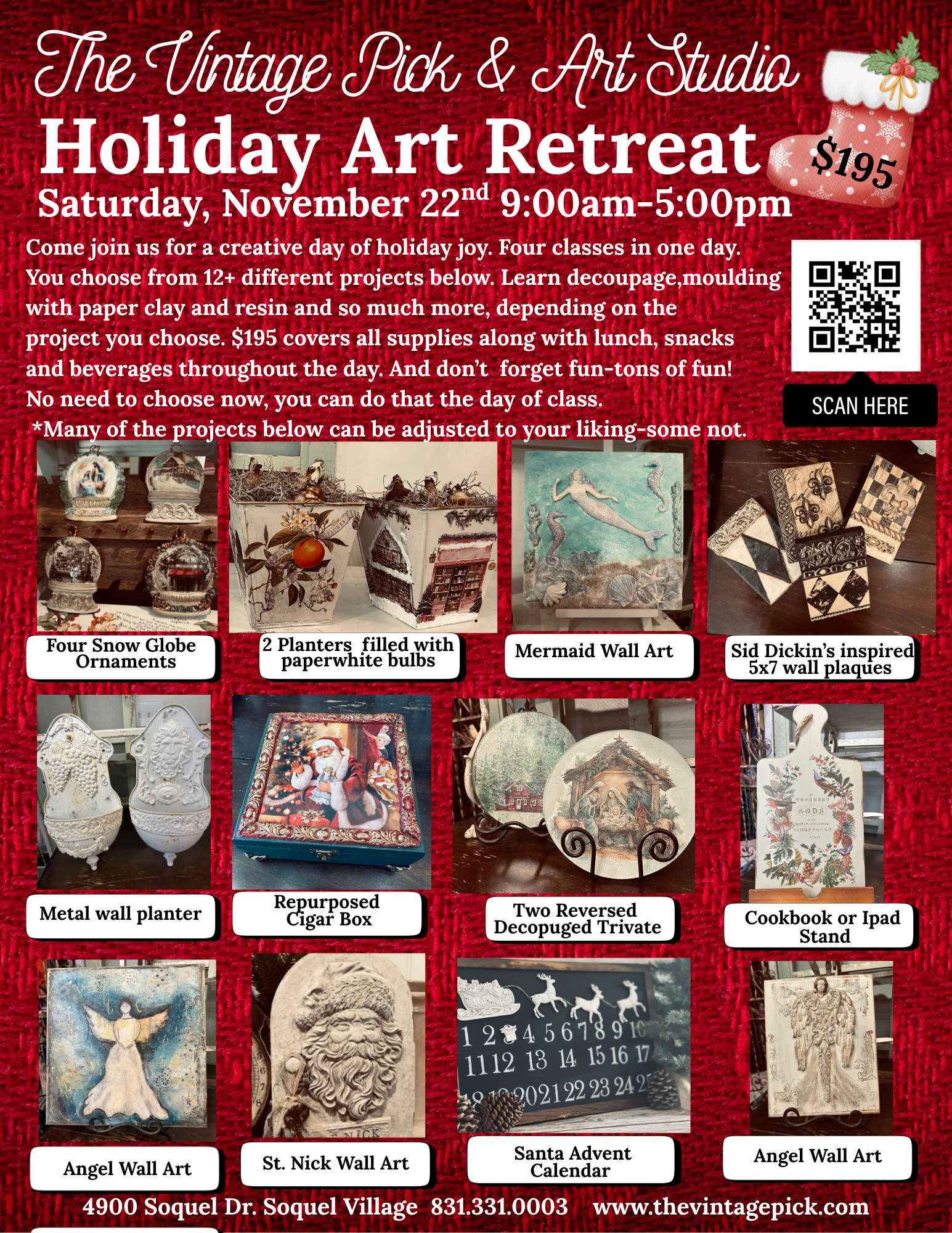 Come join us for a creative day of holiday joy. Four classes in one day. You choose from 12+ different projects below. Learn decoupage , moulding with paper clay and resin and so much more. $195 covers all your supplies along with lunch, snacks and beverages throughout the day. And don't forget fun-tons of fun!